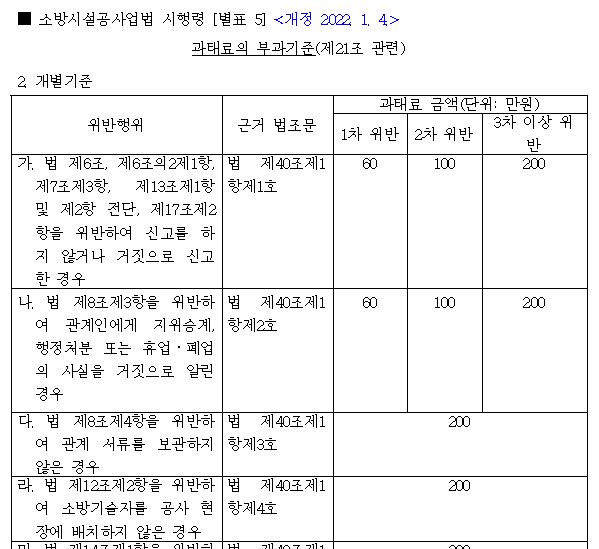 소방시설공사업법 제40조/소방시설공사업법 시행령 [별표 5] 참고