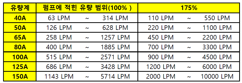 | 유량계 | 펌프에 적힌 유량 범위(100% ) | 175% |