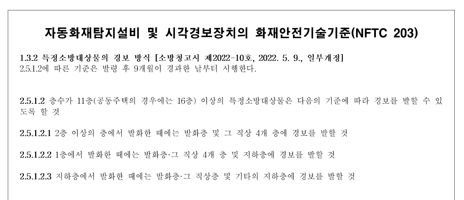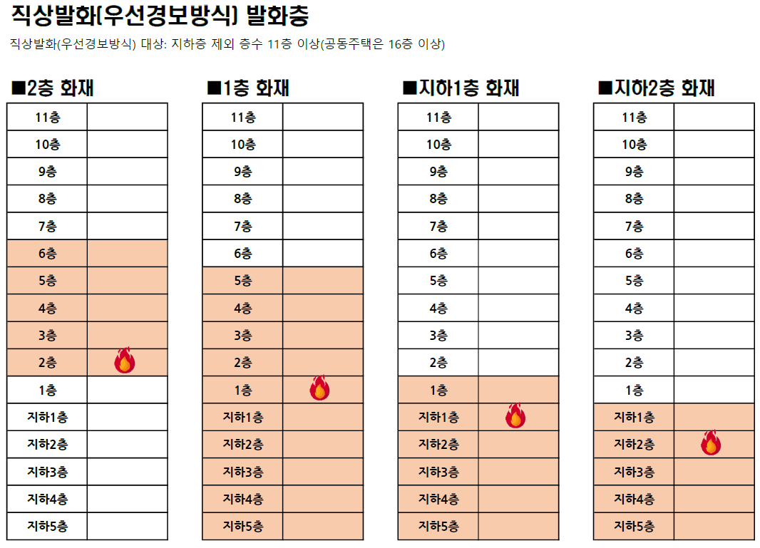 <직상발화(우선경보방식) 대상: 지하층 제외 층수 11층 이상(공동주택은 16층 이상) 23.2.10. 시행>