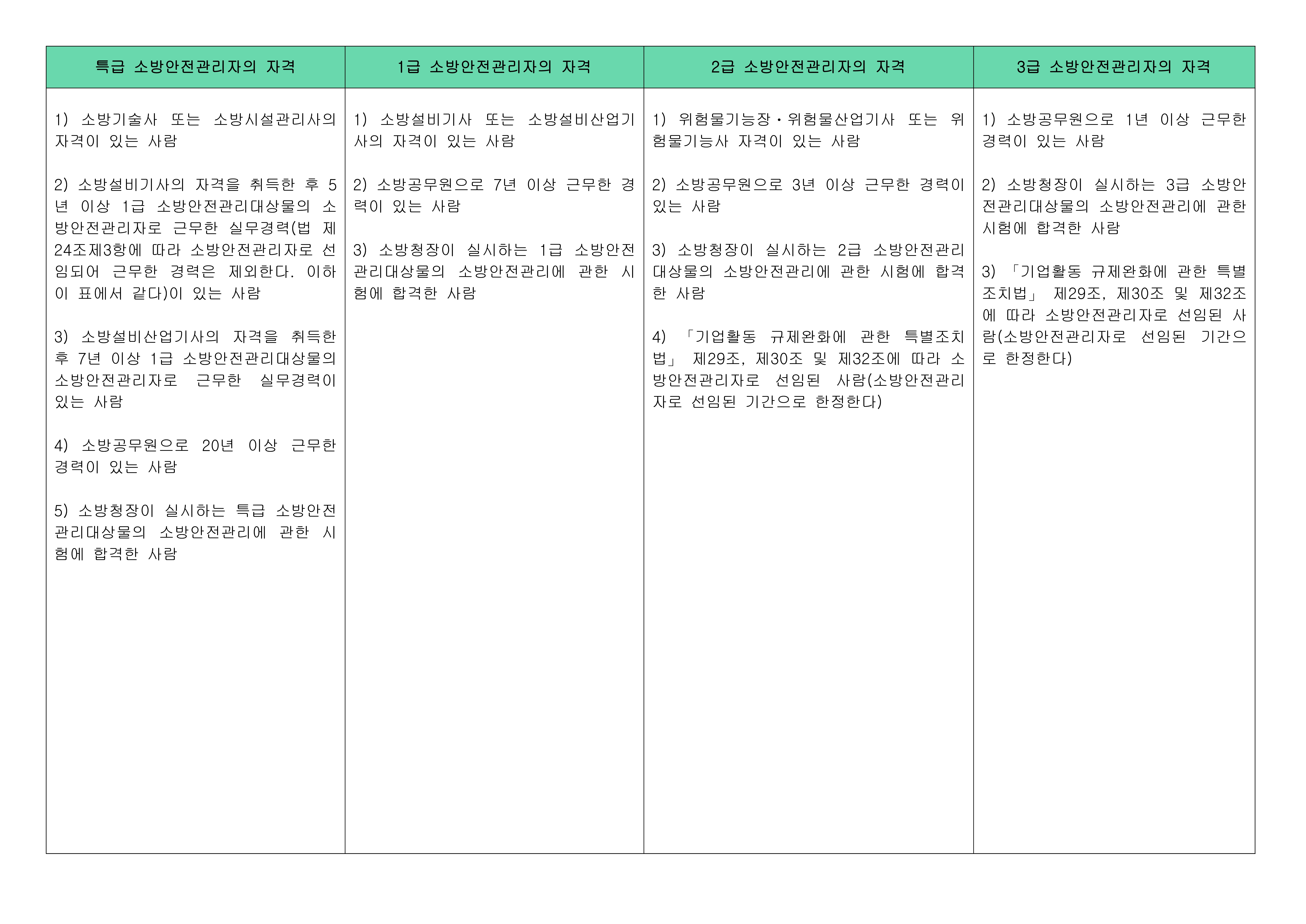 | 특급 소방안전관리자의 자격 | 1급 소방안전관리자의 자격 | 2급 소방안전관리자의 자격 | 3급 소방안전관리자의 자격 |