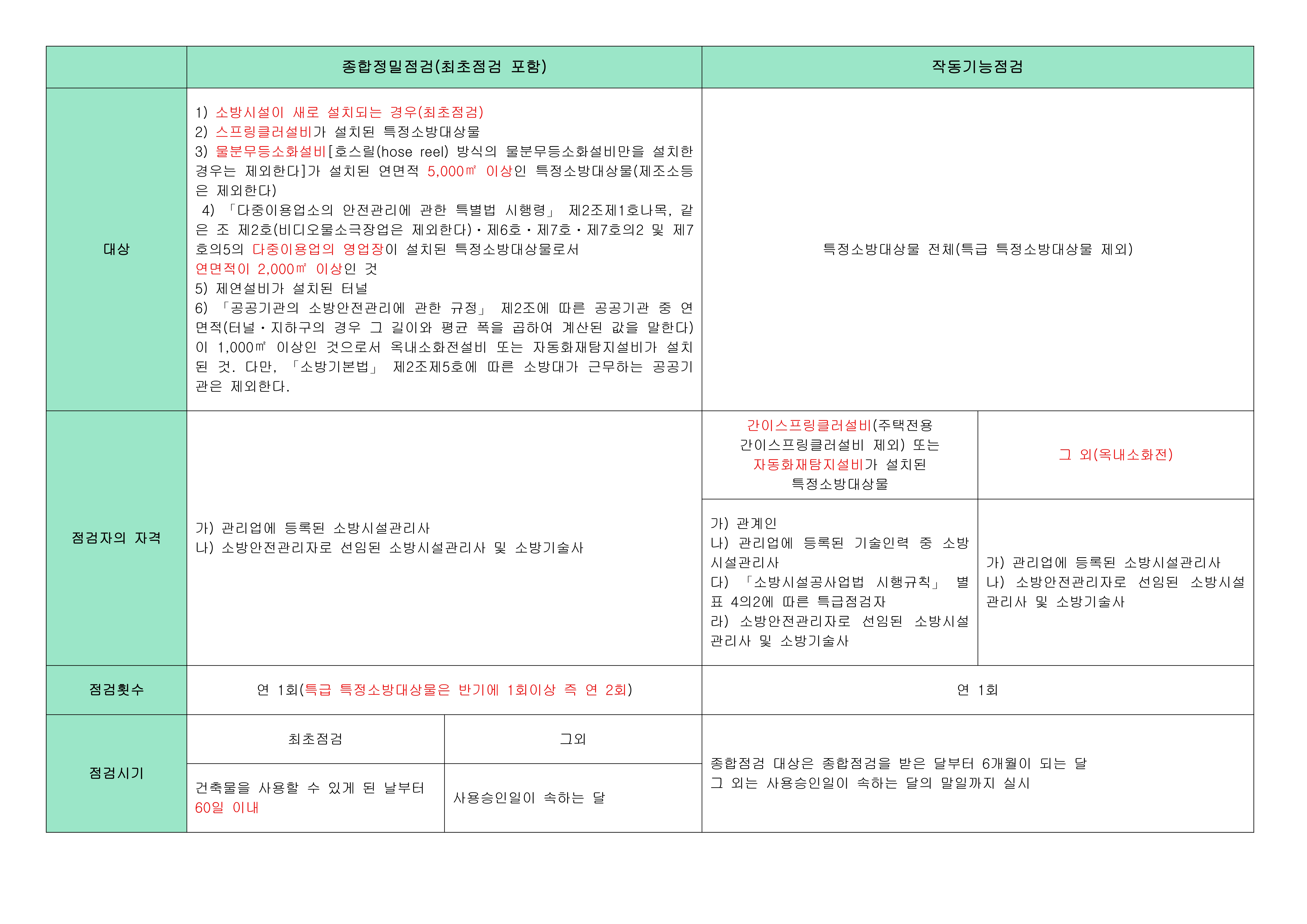 종합정밀점검 및 작동기능점검 대상/횟수/시기 등 비교