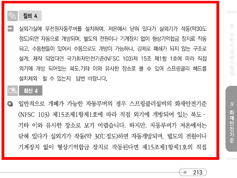 | 옥탑층 소방시설(옥내소화전, 스프링클러, 알람밸브, 자탐) 설치유무? [질의회신] (0) | 2024.05.27 |