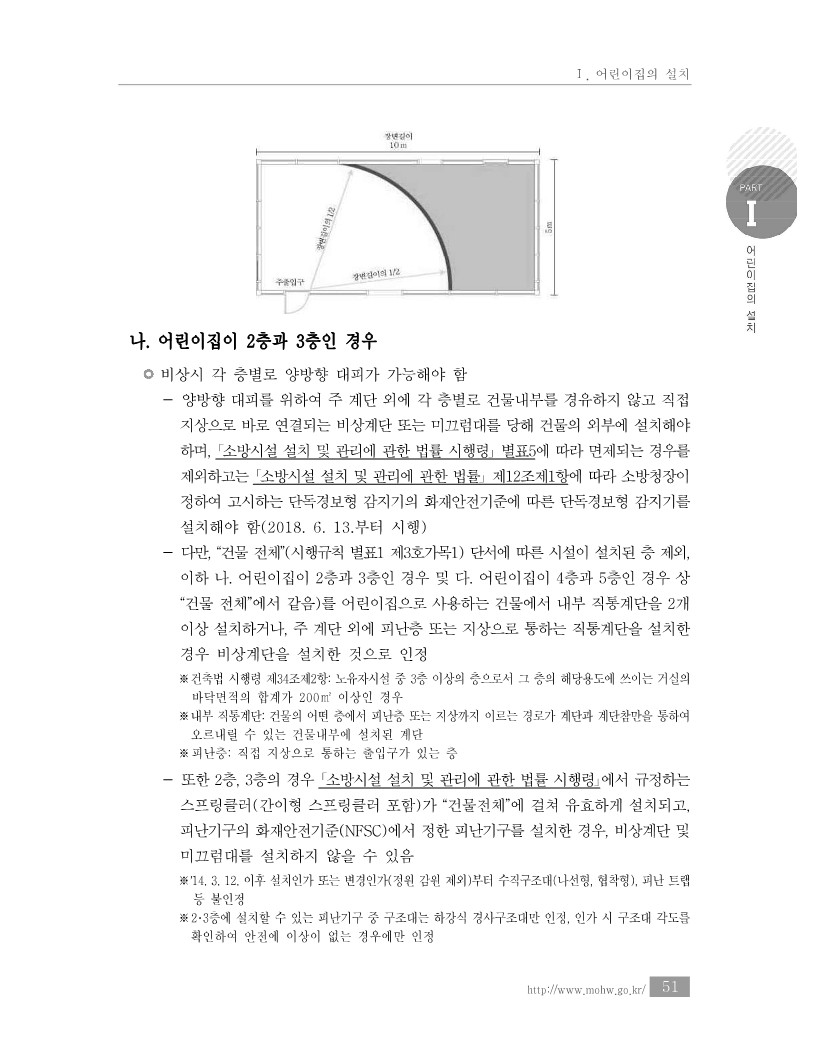 가. 어린이집이 1층인 경우 비상시 양방향 대피가 가능해야 함 - 양방향 대피를 위하여 주출입구 외에 안전한 지상과 바로 연결되는 비상구 또는 출구(이하 출구)를 설치해야 함 - 출구는 비상구 또는 유사시 사람의 출입이 가능한 창 등의 개구부로서 규격은 유효폭 0.75m 이상, 유효높이 1.75m 이상으로 설치해야 함(강화통유리 설치 시 비상구 규격에 맞고, 옆에 비상망치 구비 시 출구로 인정) - 출구의 하단은 안전한 외부 지표면으로부터 1.2m 이하여야 하며, 건물 외부의 도로 또는 대지 등에 안전하게 직접 연결되어야 함 - 출구는 어린이집 주출입구의 반대방향 또는 당해 층 장변길이의 1/2 이상 이격해야 함(아래 그림 참조) - 출구까지의 경로 상에는 주방 등 화기시설을 설치할 수 없으며, 출구 접근 및 개방에방해되는 장애물을 적치할 수 없음 - 「소방시설 설치 및 관리에 관한 법률 시행령」 별표5에 따라 면제되는 경우를 제외하고는 「소방시설 설치 및 관리에 관한 법률」 제12조제1항에 따라 소방청장이 정하여 고시하는 단독경보형 감지기의 화재안전기준에 따른 단독경보형 감지기를 설치할 것(2018. 6. 13.부터 시행 - ʼ09. 7. 3. 이전에 1층에 설치된 어린이집의 경우, 종전의 규정에 따름(영유아보육법시행규칙 부칙 124호 제3조제2항, 2009. 7. 3.) ⦁장변길이는 건물(어린이집)의 긴 면의 길이로, 그림에서의 장변은 10m가 됨 ⦁그림과 같이 주출입구가 좌측 하단에 있다면, 가능하다면 비상구는 우측 상단에 위치하는 것이 이상적인 위치임 ⦁하지만 인접건물과의 거리, 비상구 위치장소에 내력벽 등이 있어서 우측상단에 설치하기 어렵다면, 적어도 주출입구에서 장변의 1/2(도면의 경우 5m)이상 떨어진 거리이상 설치해야 함(그림기준으로는 적어도 어둡게 표시된 부분의 벽체에 설치하는 것이 원칙임) Ⅰ. 어린이집의 설치 http://www.mohw.go.kr/ 51 나. 어린이집이 2층과 3층인 경우 비상시 각 층별로 양방향 대피가 가능해야 함 - 양방향 대피를 위하여 주 계단 외에 각 층별로 건물내부를 경유하지 않고 직접 지상으로 바로 연결되는 비상계단 또는 미끄럼대를 당해 건물의 외부에 설치해야 하며, 「소방시설 설치 및 관리에 관한 법률 시행령」 별표5에 따라 면제되는 경우를 제외하고는 「소방시설 설치 및 관리에 관한 법률」 제12조제1항에 따라 소방청장이 정하여 고시하는 단독경보형 감지기의 화재안전기준에 따른 단독경보형 감지기를 설치해야 함(2018. 6. 13.부터 시행) - 다만, “건물 전체”(시행규칙 별표1 제3호가목1) 단서에 따른 시설이 설치된 층 제외, 이하 나. 어린이집이 2층과 3층인 경우 및 다. 어린이집이 4층과 5층인 경우 상 “건물 전체”에서 같음)를 어린이집으로 사용하는 건물에서 내부 직통계단을 2개 이상 설치하거나, 주 계단 외에 피난층 또는 지상으로 통하는 직통계단을 설치한 경우 비상계단을 설치한 것으로 인정 ※ 건축법 시행령 제34조제2항: 노유자시설 중 3층 이상의 층으로서 그 층의 해당용도에 쓰이는 거실의 바닥면적의 합계가 200㎡ 이상인 경우 ※ 내부 직통계단: 건물의 어떤 층에서 피난층 또는 지상까지 이르는 경로가 계단과 계단참만을 통하여 오르내릴 수 있는 건물내부에 설치된 계단 ※ 피난층: 직접 지상으로 통하는 출입구가 있는 층 - 또한 2층, 3층의 경우 「소방시설 설치 및 관리에 관한 법률 시행령」에서 규정하는 스프링클러(간이형 스프링클러 포함)가 “건물전체”에 걸쳐 유효하게 설치되고, 피난기구의 화재안전기준(NFSC)에서 정한 피난기구를 설치한 경우, 비상계단 및 미끄럼대를 설치하지 않을 수 있음 ※ ʼ14. 3. 12. 이후 설치인가 또는 변경인가(정원 감원 제외)부터 수직구조대(나선형, 협착형), 피난 트랩 등 불인정 ※ 2・3층에 설치할 수 있는 피난기구 중 구조대는 하강식 경사구조대만 인정, 인가 시 구조대 각도를 확인하여 안전에 이상이 없는 경우에만 인정 2024년도 보육사업안내 52 보건복지부 하강식 경사구조대 구조 하강식 경사구조대 - 비상계단, 미끄럼대 설치 공통기준(이하 비상계단 등) ① 비상계단 등은 주출입구 반대방향 또는 일정한 거리(출구가 당해 층 장변길이의 1/2 이상 이격)를 두고 설치해야 하며(앞 그림 참조), 보육실로부터의 비상계단등에 이르는 보행거리는 30m 이내가 되도록 설치하는 것을 원칙으로 함 * ’17. 3. 1. 이후 신규・변경인가를 받는 경우부터 해당기준 적용 ② 비상계단 등은 그 기점은 대피를 필요로 하는 층에, 그 종점은 어린이집 외부의안전한 지상에 고정적으로 설치해야 함(고정식 원칙) ③ 비상계단 등은 사용자의 하중을 고려하여 튼튼한 기초위에 기둥과 지지대를 설치해야 하며, 필요시 보조기둥을 설치해야 함 ④ 비상계단 등으로 통하는 출구와 비상계단 등까지의 사이에 단차가 있는 경우, 안전하게 접근할 수 있는 구조여야 함 ⑤ 비상계단 등에 진입하는 출구가 건물 출입문(비상구)인 경우, 출입문은 대피방향으로 열리도록 함 ⑥ 비상계단 등에 진입하기 위한 출구가 창문 등의 개구부인 경우 ⦁출구는 건물 바닥으로부터 1m 이내여야 함. 출구와 건물 바닥과의 높이차가 50㎝ 이상인 경우 유효하게 밟고 올