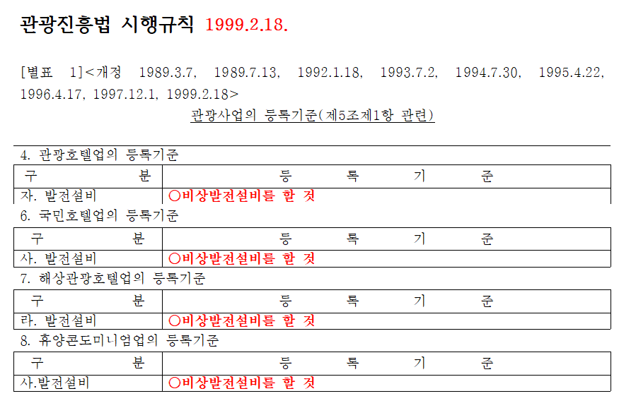 | 관광진흥법 시행규칙 [별표1] 관광사업의 등록기준(제5조제1항 관련) 1999.2.18. 관광진흥법 시행령 [별표1] 관광사업의 등록기준(제5조제1항 관련) 1999.5.10. 비상발전기설치 항목 삭제 |