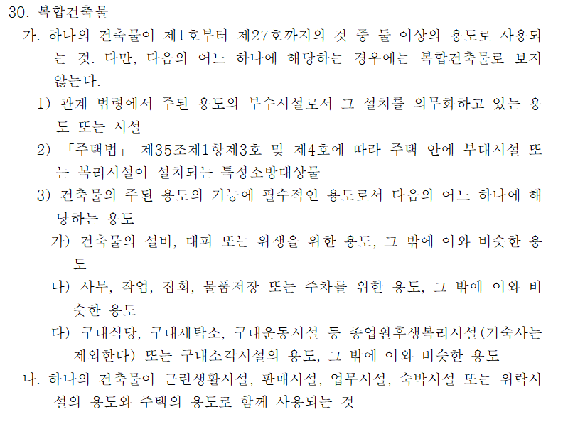 | 복합건축물 | 하나의 건축물이 둘 이상의 용도로 사용되는 것.(지하구, 문화재 제외) |