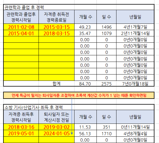 소방 감리원 등급 계산기(자격 취득전 경력50% 계산기/엑셀)