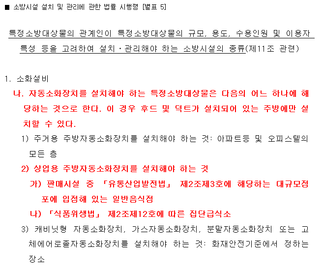 상업용 주방자동소화장치 설치대상(장소)(23.12.01.시행)