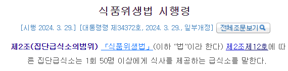 제2조(집단급식소의범위) 「식품위생법」(이하 “법”이라 한다) 제2조제12호에 따른 집단급식소는 1회 50명 이상에게 식사를 제공하는 급식소를 말한다.