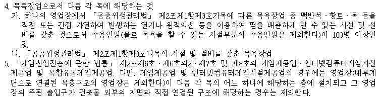 1.휴게음식점영업ㆍ제과점영업 또는 일반음식점영업으로서 영업장으로 사용하는 바닥면적합계가 100제곱미터(영업장이 지하층에 설치된 경우에는 그 영업장의 바닥 면적 합계가 66제곱미터) 이상인 것. 다만, 영업장(내부계단으로 연결된 복층구조의 영업장을 제외한다)이 지상1층 또는 지상과 직접 접하는 층에 설치되고 그 영업장의 주된 출입구가 건축물 외부의 지면과 직접 연결되는 곳에서 하는 영업을 제외한다. 2.휴게음식점영업ㆍ제과점영업 또는 일반음식점영업에 사용되는 공유주방을 운영 하는 영업으로서 영업장 바닥면적의 합계가 100제곱미터(영업장이 지하층에 설치된 경우에는 그 바닥면적 합계가 66제곱미터) 이상인 것. 다만, 영업장(내부계단으로 연결된 복층구조의 영업장은 제외한다)이 지상1층 또는 지상과 직접 접하는 층에 설치되고 그 영업장의 주된 출입구가 건축물 외부의 지면과 직접 연결되는 곳에서 하는 영업은 제외한다. 3.단란주점영업, 유흥주점영업 4.영화상영관, 비디오물감상실업, 비디오물소극장업, 복합영상물제공업 5.학원의 수용인원이 300명 이상인 것 6.방화구획 안된 하나의 건축물에 학원과 기숙사가 함께 있는 학원(수용인원 100명 이상 300명미만) 7.방화구획 안된 방화구획 안된 하나의 건축물에 학원이 둘 이상 있는 경우(학원의 수용인원이 300명 이상) 8.방화구획 안된 하나의 건축물에 다른 다중이용업과 학원이 함께있는 경우 9.목욕탕+찜질방-물로 목욕을 할 수 있는 시설 및 설비를 갖춘 목욕장업 중 맥반석ㆍ 황토ㆍ옥 등을 직접 또는 간접 가열하여 발생하는 열기나 원적외선 등을 이용하여 땀을 배출하게 할 수 있는 시설 및 설비를 갖춘 것으로서 수용인원(물로 목욕을 할 수 있는 시설부분의 수용인원은 제외한다)이 100명 이상 10.찜질방-맥반석ㆍ황토ㆍ옥 등을 직접 또는 간접 가열하여 발생되는 열기 또는 원적외선 등을 이용하여 땀을 낼 수 있는 시설 및 설비를 갖춘 목욕장업 11. 게임제공업ㆍ인터넷컴퓨터게임시설제공업 및 복합유통게임제공업. 다만, 게임제공업 및 인터넷컴퓨터게임시설제공업의 경우에는 영업장(내부계단으로 연결된 복층구조의 영업장은 제외한다)이 지상1층 또는 지상과 직접 접하는 층에 설치되고 그 영업장의 주된 출입구가 건축물 외부의 지면과 직접 연결된 구조에 해당하는 경우는 제외한다. 12.노래연습장업 13.산후조리업 14.고시원업 15.권총사격장 16.가상체험 체육시설업(실내에 1개 이상의 별도의 구획된 실을 만들어 골프 종목의 운동이 가능한 시설을 경영하는 영업으로 한정한다) 17.화재위험평가결과 위험유발지수가 디(D) 등급 또는 이(E) 등급인 경우 18.전화방업, 화상대화방업, 수면방업, 콜라텍업, 방탈출카페업, 키즈카페업, 만화카페업 |