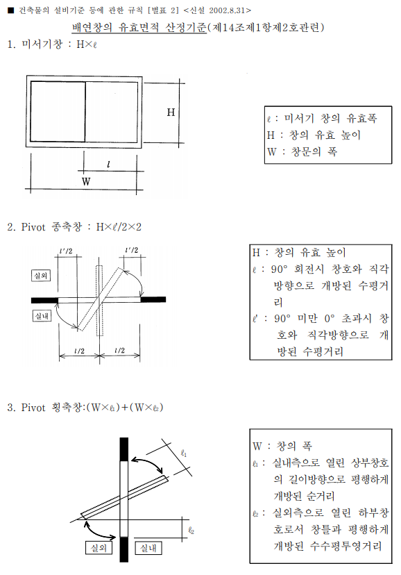 2. 배연창의 유효면적은 별표 2의 산정기준에 의하여 산정된 면적이 1제곱미터 이상으로서 그 면적의