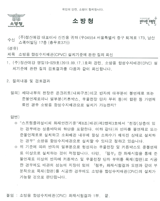 인 경우 CPVC(소방용 합성수지배관) 시공 가능한가요?